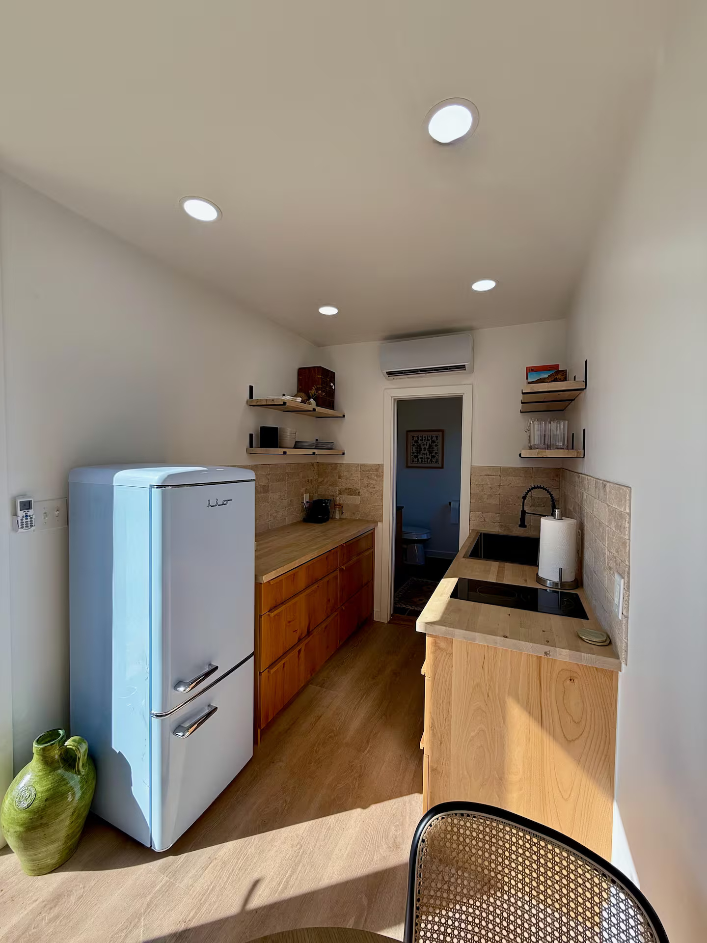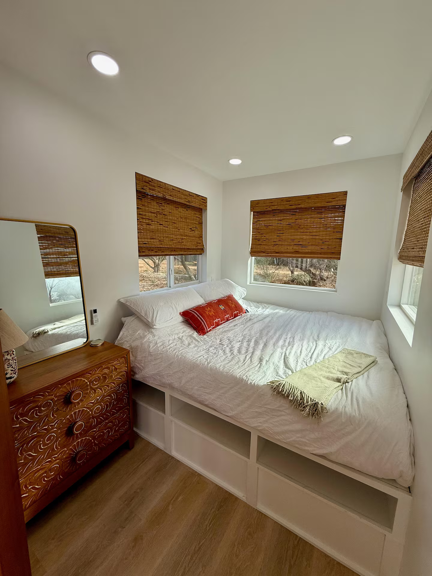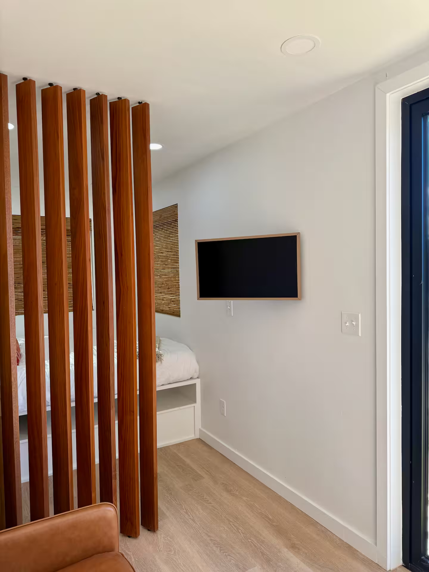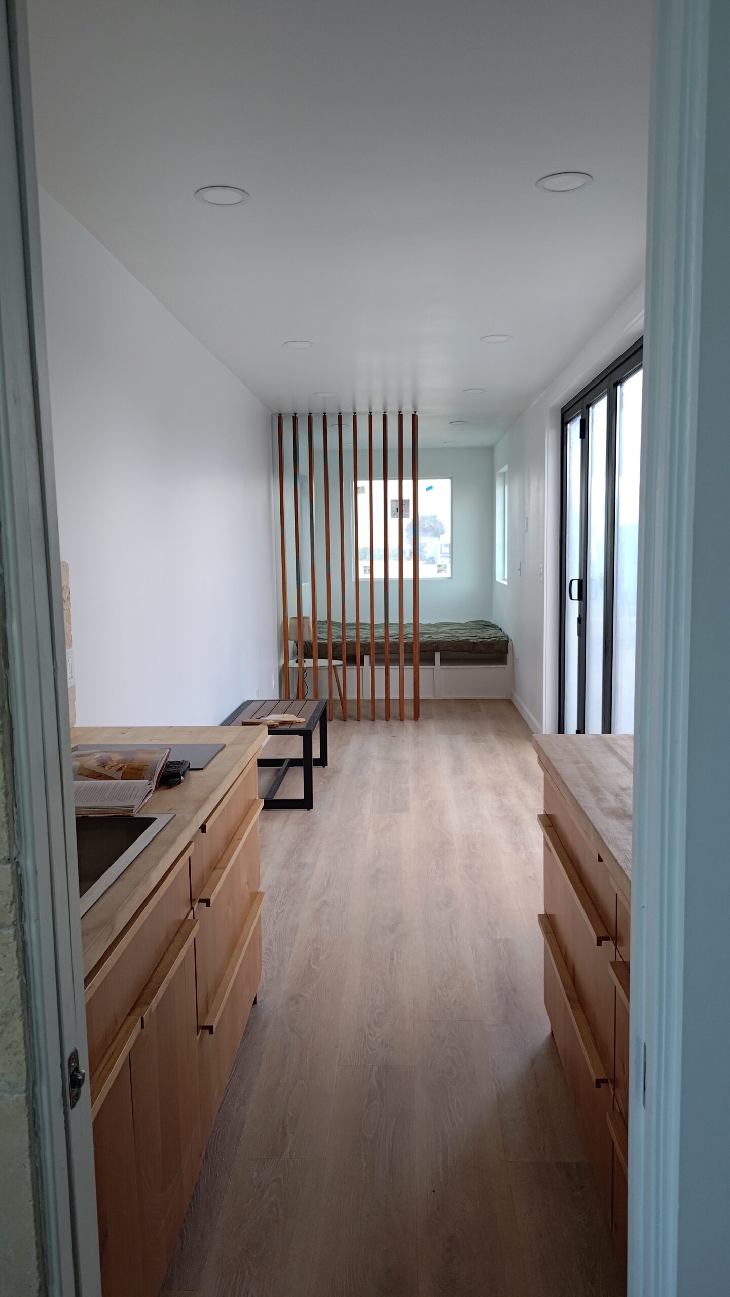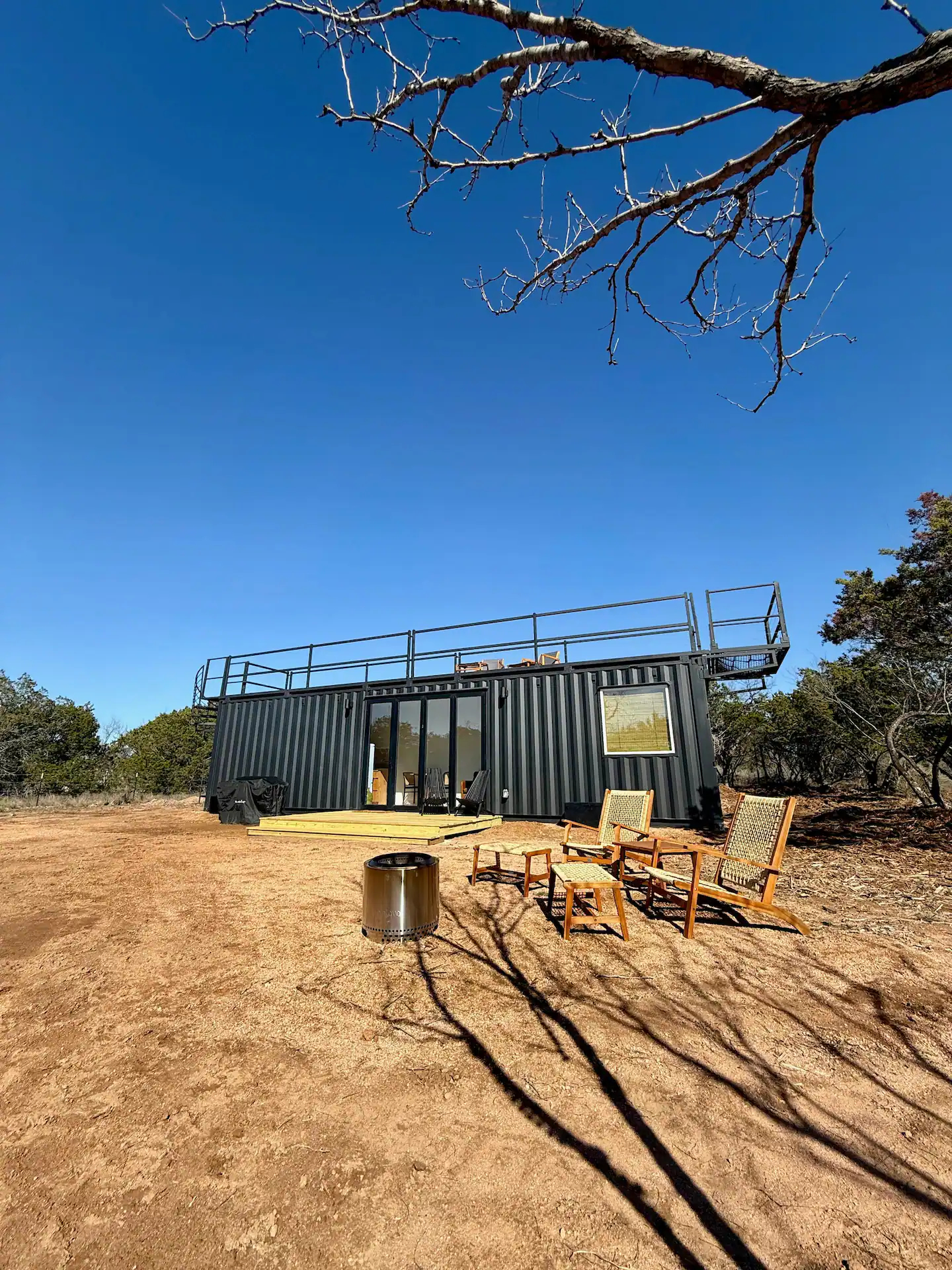 The Burnet is a luxury container home similar to The Porter model without the garage door. This unit features an outdoor spiral staircase to the deck with a comfortable hammock as well as a slat wall for the bedroom which can be opened or closed for privacy.